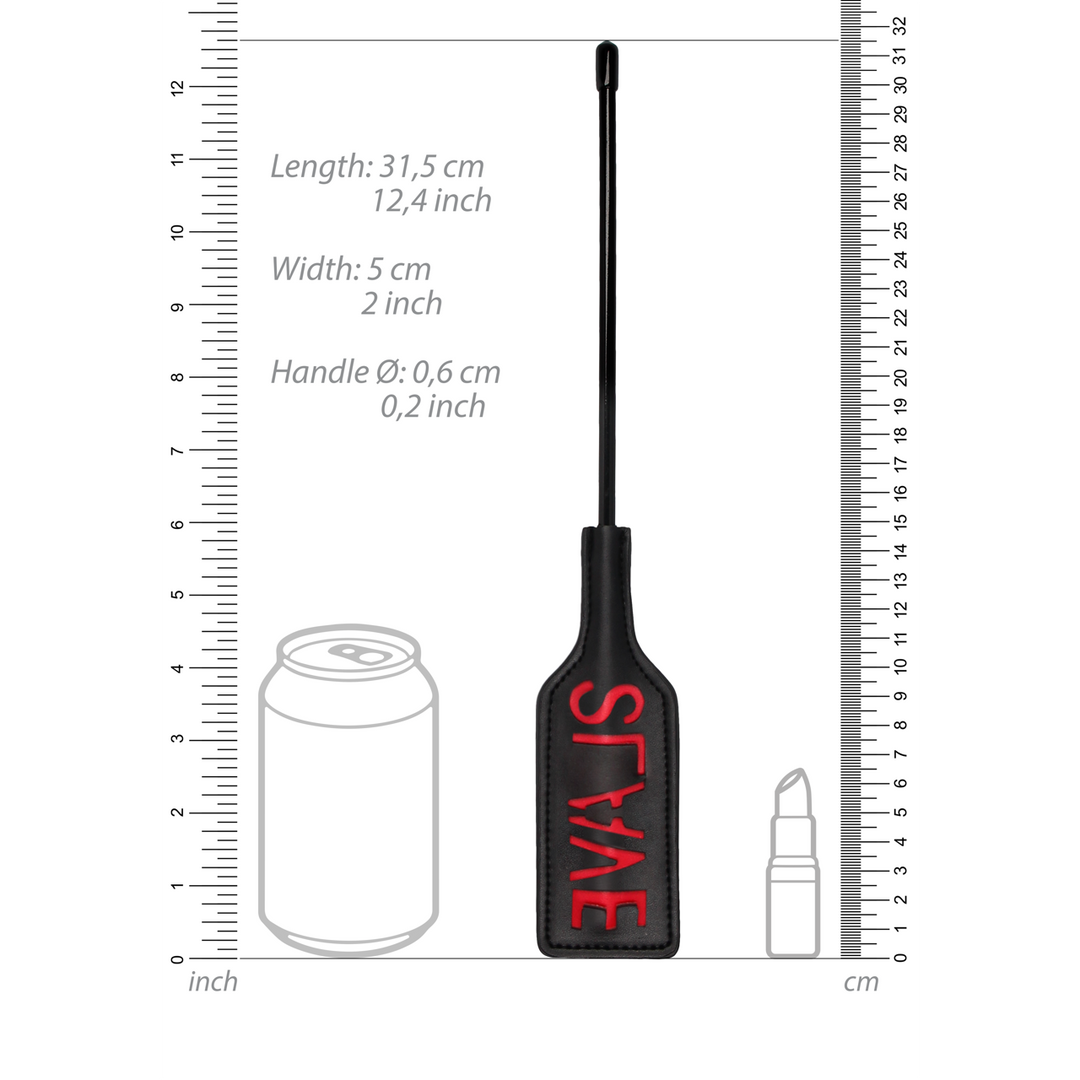 Leave a lasting impression on your partner. This short handled rectangular shaped crop is the perfect way to discipline your partner. Leave a lasting impression on your sub. The word SLAVE is reversed so it will show up on their skin.
