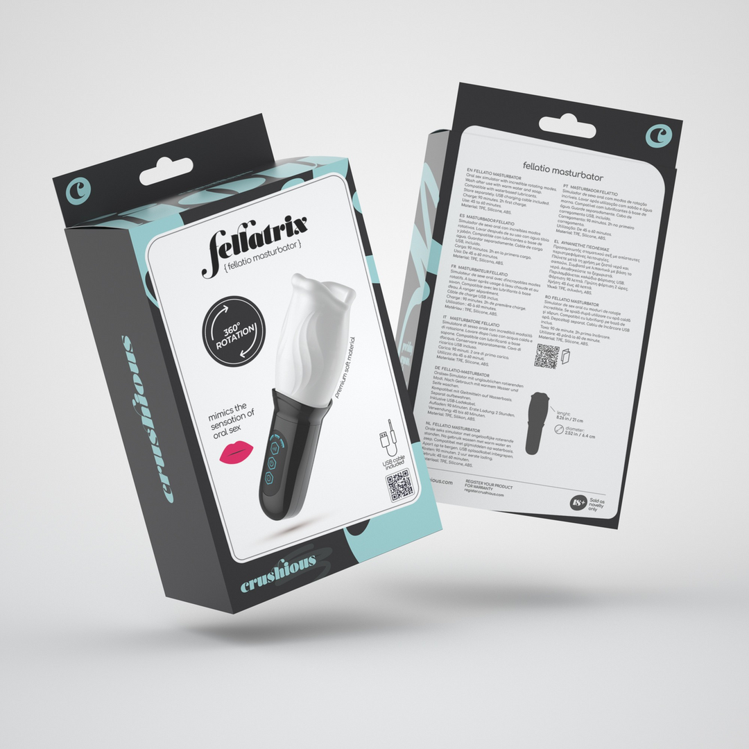 Fellatrix is een high-end oplaadbare masturbator gemaakt voor jou!. De zachte en diepe mond is altijd klaar om je penis te verzwelgen en te strelen met zijn inwendige tongen tot volledige extase, wanneer je maar wilt. De innovatieve 360° rotatie zorgt ervoor dat de tongen van Fellatrix je penis in zijn geheel kunnen bereiken en niets onaangeroerd laten. Fellatrix is waterproof en lichaamsvriendelijk.Fellatrix heeft 3 verschillende snelheden en 4 roterende standen voor jou om uit te kiezen. Schakel tussen de verschillende standen door gewoon de knoppen aan te raken. Druk 3 seconden op de centrale knop om aan en uit te zetten.USB oplaadbare speeltjes zorgen ervoor dat je ze elke keer weer op volle kracht kunt gebruiken. Zorg ervoor dat de batterij opgeladen is voordat je ermee gaat spelen. Het blauwe lampje knippert wanneer je de oplader aansluit om aan te geven dat de batterij wordt opgeladen. Als de batterij volledig is opgeladen, brandt het lampje constant. 90 minuten volledig opladen. De eerste keer opladen duurt 2 uur.Gebruik je Fellatrix 45 minuten op hogere snelheid en 60 minuten op lagere snelheid.Schoonmaken gaat in een handomdraai, haal de 2 delen uit elkaar, veeg de basis af met een natte doek of gebruik een reinigingsspray voor speelgoed. Was de beker met lauw water en neutrale zeep of gebruik een reinigingsspray voor speelgoed. Klop hem droog en bewaar hem uit de buurt van licht- en warmtebronnen. Het gebruik van glijmiddel wordt aangeraden voor een betere ervaring. Gebruik altijd glijmiddel op waterbasis, oliën en andere glijmiddelen beschadigen de integriteit van het materiaal.Crushious glijmiddelen zijn de beste aanvulling op je Crushious speeltjes.Afmetingen:21 cm lang 6,4 cm in diameter.Materiaal:TPE, ABS, Silicone.