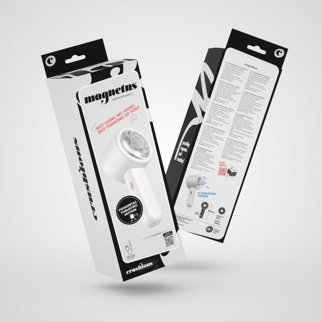 Magnetus biedt je de beste handjob ervaring ooit! Houd hem gewoon bij het handvat vast en laat hem je behagen in 6 verschillende stuwritmes.Magnetus is speciaal ontworpen om extra stimulatie te geven aan de eikel. Houd er rekening mee dat Magnetus stopt als je hem verder naar de basis van de penis duwt. Dit is een innovatieve drukpuntsensor die zowel jou als het speeltje beschermt en het gebruik op de lange termijn bevordert. Leun achterover, ontspan en geniet van elke ongelooflijke slag.USB-oplaadbare speeltjes zorgen ervoor dat je ze elke keer weer op volle kracht kunt gebruiken. Zorg ervoor dat de batterij opgeladen is voordat je gaat spelen. Het blauwe lampje knippert wanneer je de oplader aansluit om aan te geven dat de batterij wordt opgeladen. Als de batterij volledig is opgeladen, brandt het lampje constant. Volledig opgeladen voor 150 minuten. Gebruik je Magnetus maximaal 60 minuten.Magnetus is niet waterdicht.Gebruik:Doe de TPE hoes in het gat. Zorg ervoor dat hij goed aansluit. Breng glijmiddel op waterbasis aan op de penis en rond de sleeve. Vermijd contact van vloeistof met het plastic lichaam van de masturbator.Druk 3 seconden op de knop om in te schakelen.Druk nogmaals om te schakelen tussen de 6 stuwkrachtstanden.Om uit te schakelen, druk 2 seconden op de knop. Het lampje gaat uit.Verwijder de sleeve na gebruik.Schoonmaken gaat in een handomdraai, haal de 2 delen uit elkaar, was de sleeve met lauw water en neutrale zeep of gebruik een toy cleaning spray. Klop hem droog en bewaar hem uit de buurt van licht- en warmtebronnen. Een vochtige doek is voldoende om het apparaat af te vegen.Het gebruik van glijmiddel wordt aangeraden voor een betere ervaring. Gebruik altijd glijmiddelen op waterbasis, oliën en andere soorten glijmiddelen beschadigen de integriteit van het materiaal.Crushious glijmiddelen zijn de beste aanvulling op je Crushious speeltjes.Raadpleeg de gebruiksaanwijzing voor gebruik.Afmetingen:19,8 cm in lengte 7 cm in diameter.Materiaal:ABS, TPE.