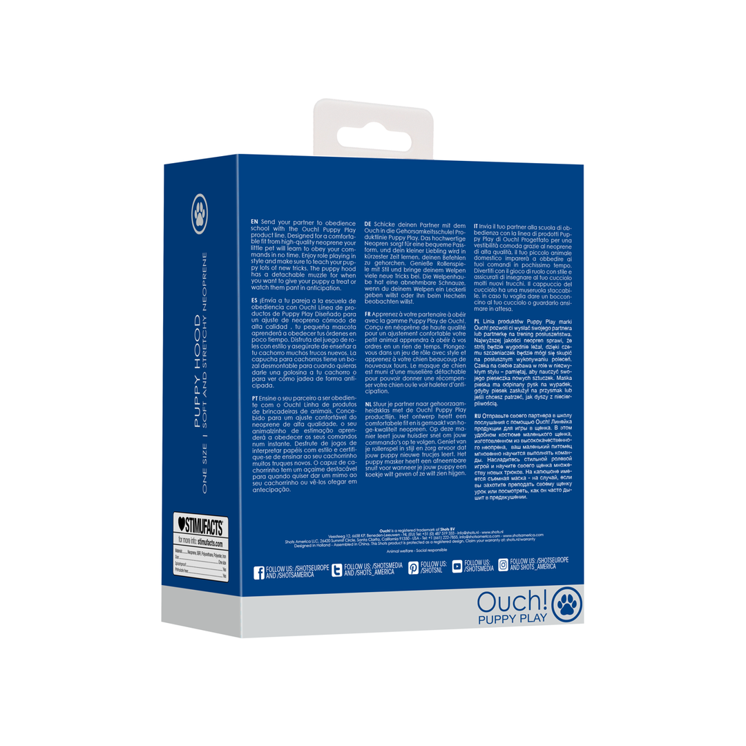 Stuur je partner naar de gehoorzaamheidschool met de Ouch! Puppy Play productlijn. Ontworpen voor een comfortabele pasvorm van hoogwaardig neopreen, zal je kleine huisdier in een mum van tijd leren om je commando’s op te volgen. Geniet van rollenspel in stijl en zorg ervoor dat je je puppy veel nieuwe trucjes leert. De puppykap heeft een afneembare muilkorf voor wanneer je je puppy een traktatie wilt geven of ze wilt zien hijgen van anticipatie.